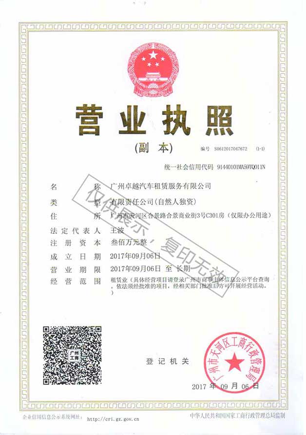 廣州卓越汽車租賃服務(wù)有限公司是經(jīng)廣州工商行政管理局審批,專業(yè)從事汽車租賃的正規(guī)公司。主要以國內(nèi)外事業(yè)單位、團(tuán)體個(gè)人、旅游公司為主要服務(wù)對象,根據(jù)客戶不同需要選配車型,提供長租、短租、旅游包車、機(jī)場接送、商務(wù)考察、公司班車、會(huì)議包車、婚禮包車、樓巴接送包車等各種活動(dòng)用車。公司擁有各種車型,所有車輛都買有高額保險(xiǎn) 如:交強(qiáng)險(xiǎn) 第三者責(zé)任險(xiǎn)車上責(zé)任險(xiǎn)等。擁有經(jīng)驗(yàn)豐富的管理團(tuán)隊(duì),配有多年駕齡,經(jīng)驗(yàn)豐富,技術(shù)過硬,熟悉廣州及珠江三角洲路線,準(zhǔn)章守法,高度敬業(yè)的司機(jī)。